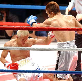 相打ちで、決着がついた。互いの左フックが、顔面をとらえた瞬間、王者の視線が宙に飛んだ。江口が追 撃の右ストレートを放つ。王者の体が空中に浮き、腰からキャンバスに落ちるダウン。挑戦者のパワーが、すさまじい輝きをみせた。