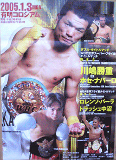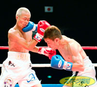 世界中で今年最も早く行われたW世界タイトルマッチは、WBC世界Sフライ級王者・川嶋勝重(30)が、無敗の最強挑戦者ホセ・ナバーロ(29)に2-1の判定勝ち。同級1位との難関の指名試合を辛くも突破、2度目の防衛に成功した。これで、5月にも世界戦での対決で1勝1敗の前王者・徳山昌守(30)=金沢=とのラバーマッチ(3度目の決着戦)に突き進む。WBA世界フライ級王座に挑んだ挑戦者・トラッシュ中沼(29)は、王者ロレンソ・パーラ(26)にテクニックと手数で圧倒され、0-3の判定負け。引退を口にした。〔写真:勝ちは、勝ち。王者・川嶋(右)が、最強挑戦者に2-1の微妙な判定勝ち。これで前王者・徳山と決着戦だ=撮影・荒木孝雄〕